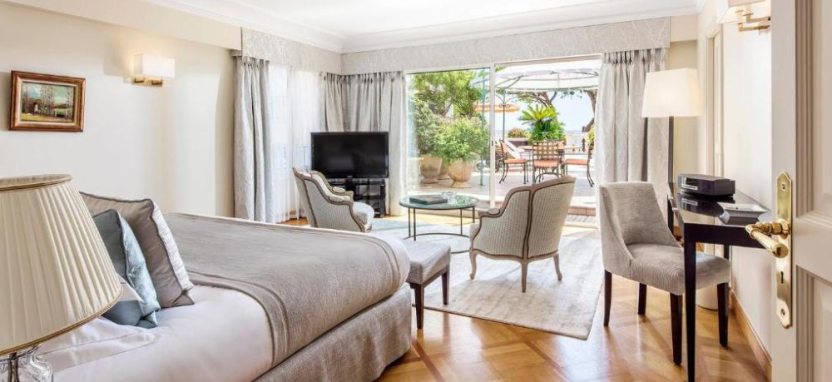 Terrace Suite (60 кв. м) - гостиная, спальня, ванная комната, терраса. Панорамный вид 180 градусов на бассейн отеля и залив Муравьев с одной стороны, а с другой - на перевал Эз. Все номера обращены к Средиземному морю.
