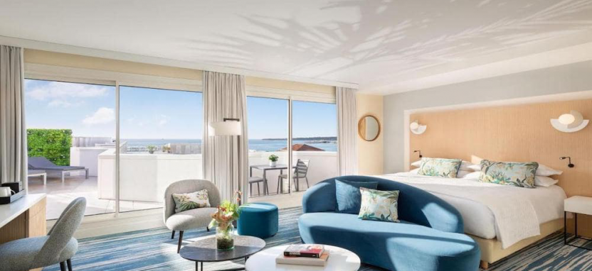 Terrasse Suite (65 кв. м) - вид на море, спальня с кроватью king-size, гостиная, обеденная зона, терраса 30 кв. м., диван-кровать, стол, панорамные окна, мраморная ванная комната с ванной и душем. Доступны смежные номера.