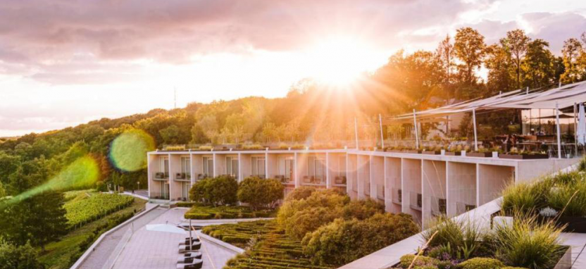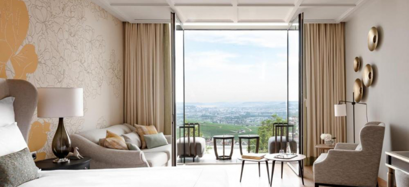 Champagne Junior Suite (50 кв. м) – номера с террасой перед садиком, позволяют разместить 2 взрослых и 1 ребенка. Зона отдыха с креслом и софой. Нижний этаж. Вид на сад и винные поля вдалеке. Кровать king-size или две одноместные кровати.
