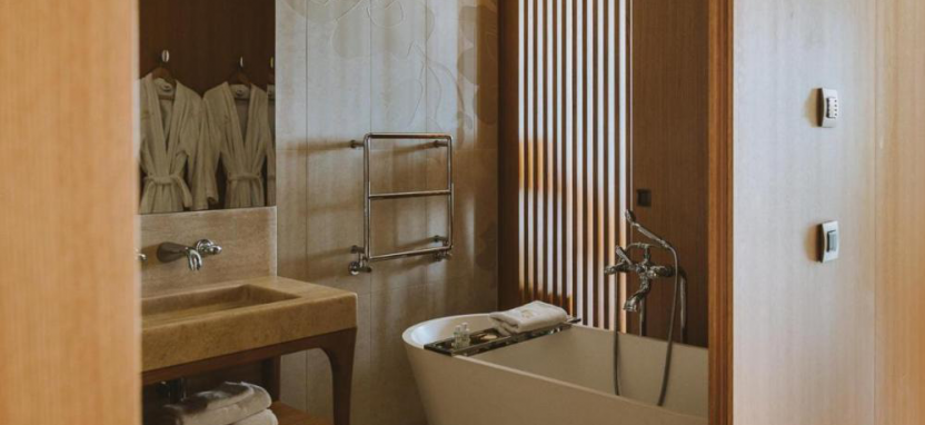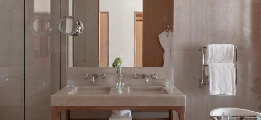 В каждом номере: ванная комната с душем, ванной, двойной раковиной из травертина, косметическая линия Hermes, фен, мини-бар с бесплатными безалкогольными напитками (пополнение ежедневно), сейф, кофе-машина и выбор чая, мягкое постельное белье. 350 MB Wi-Fi.