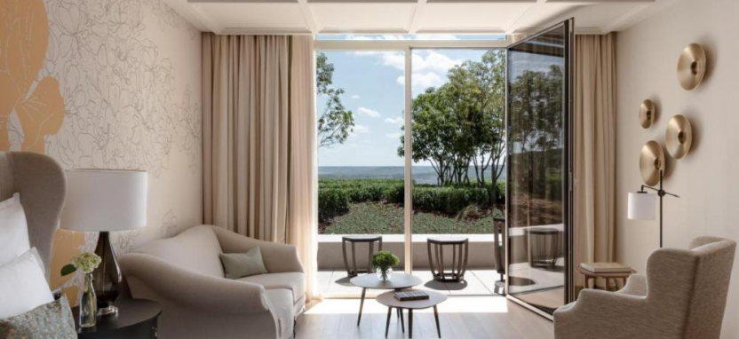 Garden Junior Suite (50 кв. м) – элегантные номера с меблированной террасой и кроватью king-size, рассчитаны на 2 гостей. Зона отдыха с креслом и софой. Нижний этаж. Вид на сад и винные поля вдалеке.