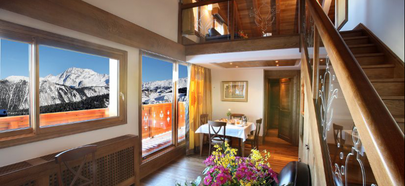В верхней части курорта Куршевель 1850, на живописной горнолыжной трассе Пралонг, в непосредственной близости от подъемников.