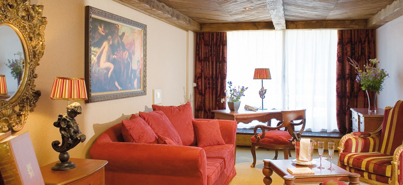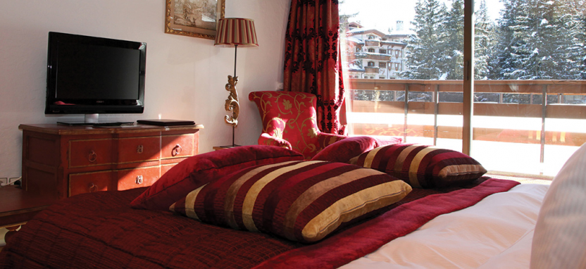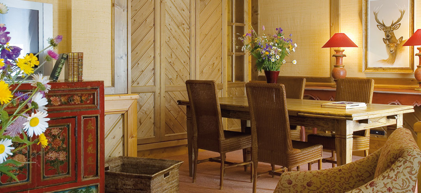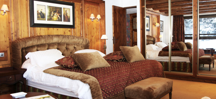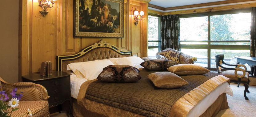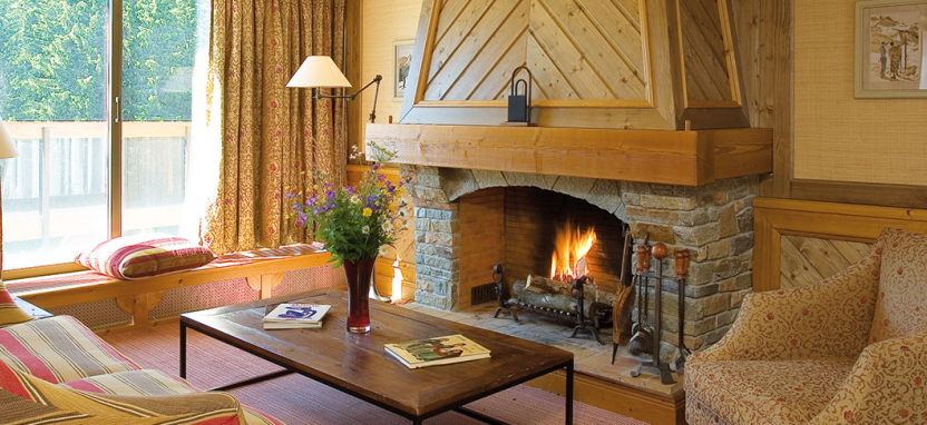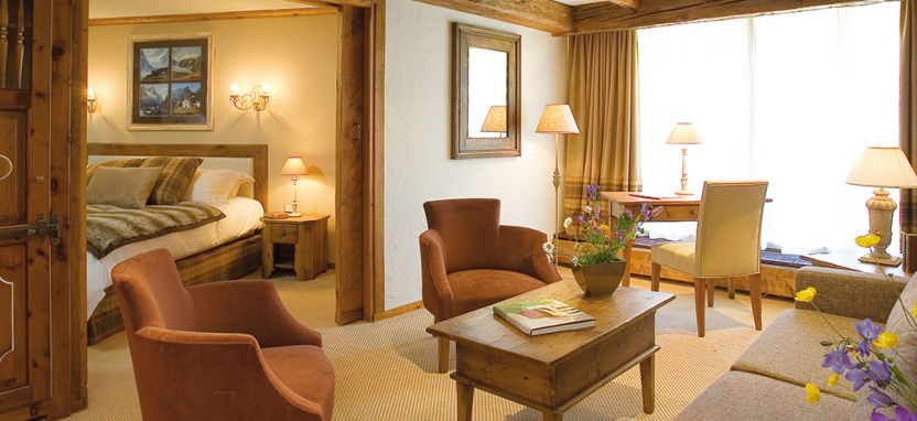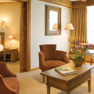 Etoile Suite 4/6 pax (120 кв. м) - звездный люкс на верхнем этаже отеля на юго-восточную сторону с видом на сосны и горные склоны, гостиная, столовая зона с камином, гостиная зона, гардеробная, 2 спальни, джакузи, 2 ванные комнаты.