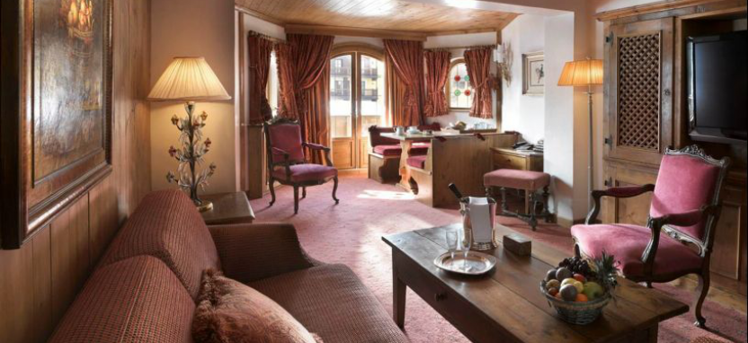 Suite du Jardin Alpin (90 кв. м) - двухкомнатный люкс, 1 этаж, западная сторона, вид на горнолыжные склоны, просторная круглая гостиная, 2 спальни каждая с отдельным входом, 2 ванные комнаты с ванной + душ с функцией парной, балкон.