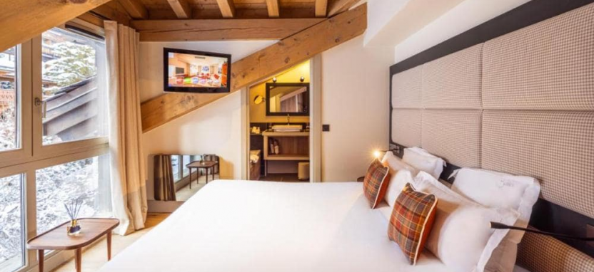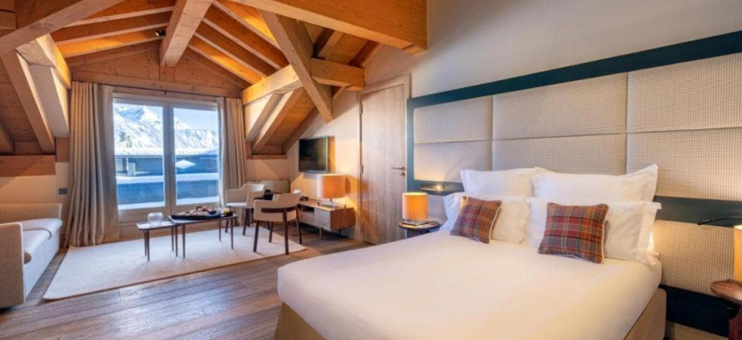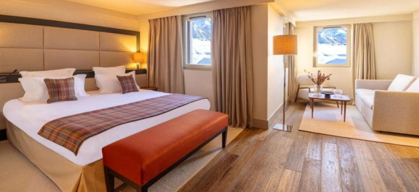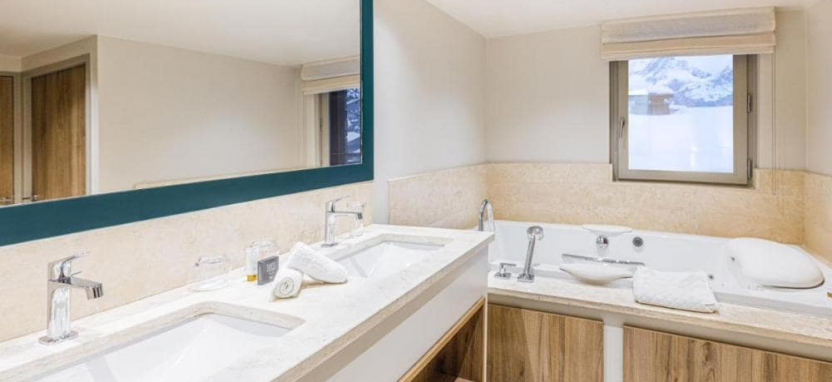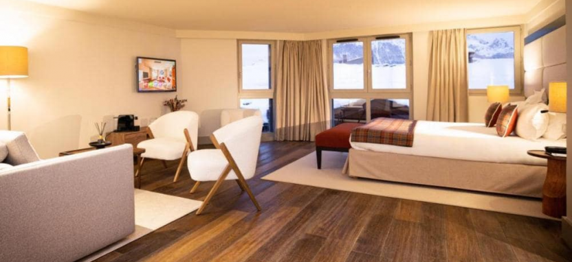 Paradise Suite (90 кв. м) - просторные сьюты, вид на курорт и горы, в отделке преобладают каштаново-коричневые оттенки, просторная гостиная с камином, отдельная спальня, ванная комната с душем + джакузи.
