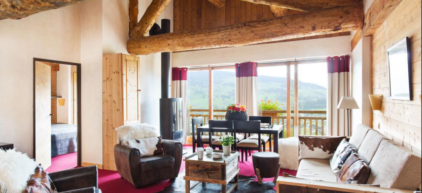 Large Suite Megeve 6 pax (50-55 кв. м) - некоторые сюиты двухуровневые, вид на курорт Межев и долину, гостиная зона, маленькая кухня, 2 спальни, 2 ванные комнаты с ванной + в большинстве номеров отдельный туалет, балкон.