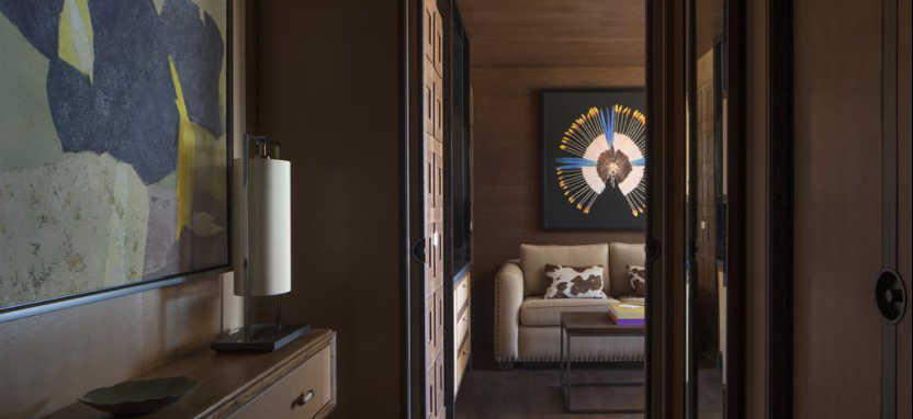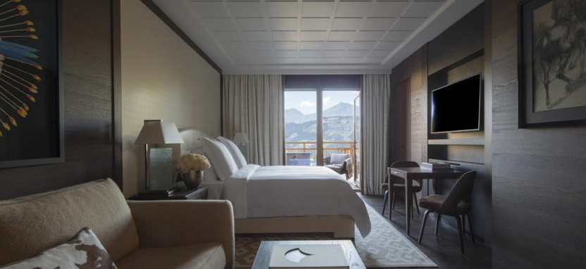 Deluxe One-Bedroom Suites 3/4 pax (78-100 кв. м) - 4 улучшенных сюита, идеально подходящие для семей, 2-5 этаж, вид на горы или долину, большая гардеробная, просторная гостиная с камином, спальня, ванная комната, отделанная мрамором, с ванной и душевой кабиной, дополнительная гостевая ванная комната, терраса.
