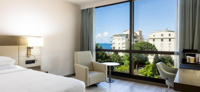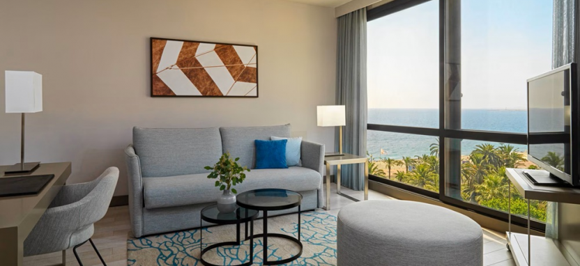 Junior Suite Sea View (34 кв. м) – полулюкс с окнами от пола до потолка и видом на море, двуспальная кровать, гостиная зона с раскладным диваном, гардеробная, ванная комната с ванной, есть смежные номера. Размещение – 4 человека.