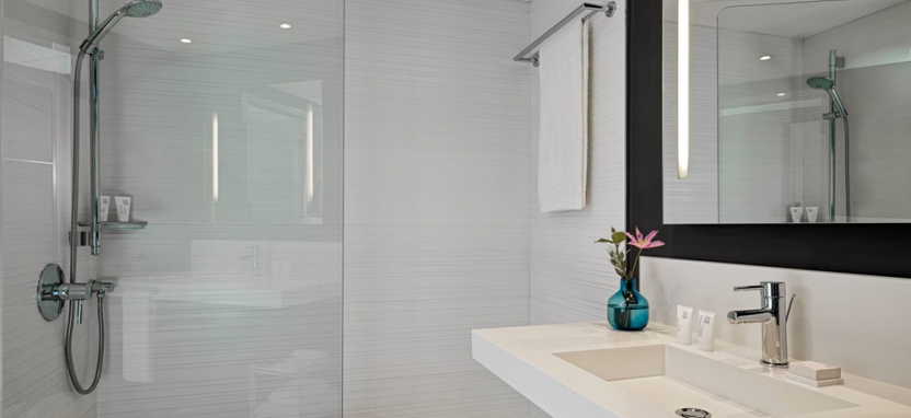 Suite (47 кв. м) – люкс с окнами от пола до потолка и видом на море, двуспальная кровать, гостиная зона с раскладным диваном, ванная комната с ванной и душем, есть смежные номера. Размещение – 4 человека.