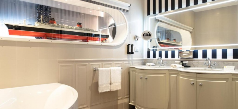 Le France Junior Suite (50 кв. м) – полулюкс в сине-белых тонах с видом на море, спальня с большой двуспальной кроватью, гардеробная, зона отдыха, ванная комната с двойной раковиной, ванной и душем, балкон. Размещение – 3 взрослых с 2 взрослых с 2 детьми (до 17 лет).