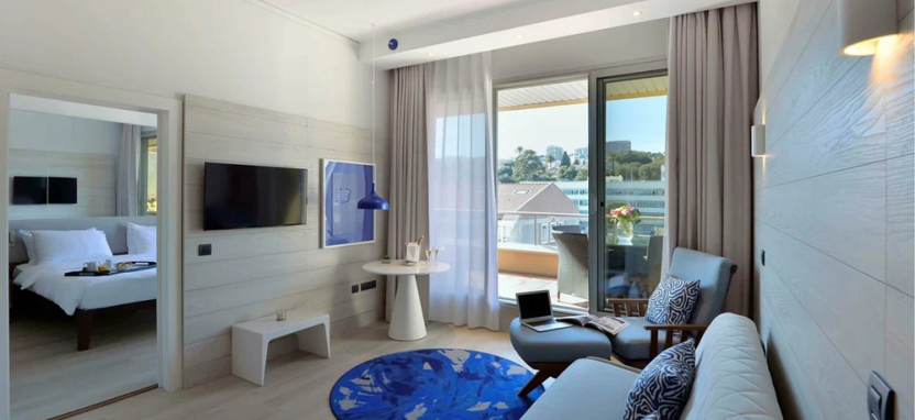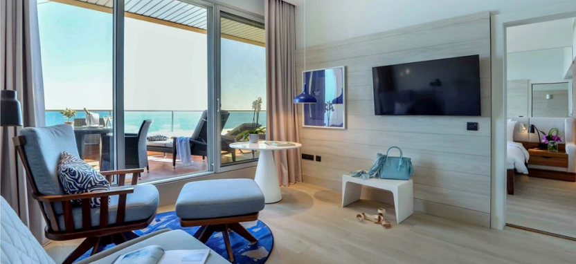 Suite with Terrace Sea View (45 кв. м) – люкс с видом на море. Спальня с кроватью king-size, отдельная гостиная, ванная комната с душем и ванной, терраса (20 кв. м). Дополнительная детская кровать предоставляется по запросу. Размещение – 4 взрослых или 2 взрослых с 2 детьми (до 12 лет).