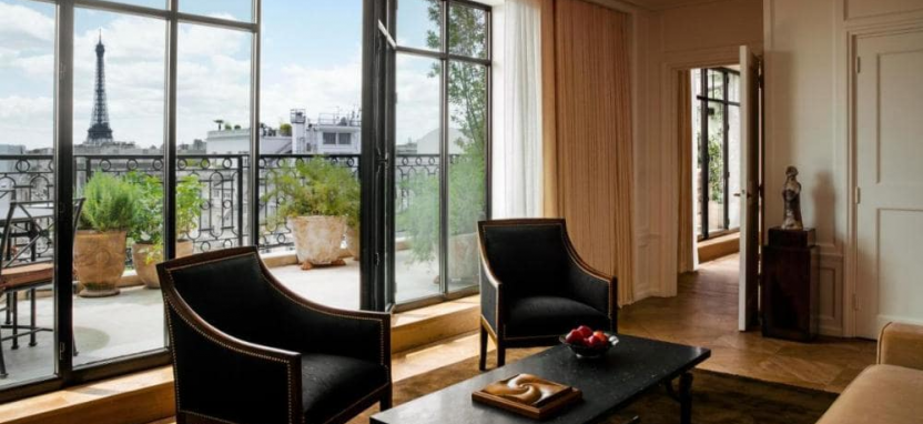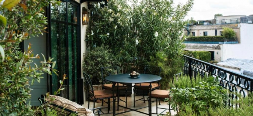 Terrace Suite (50 кв. м) - сьют с просторной террасой 25 кв. м с видом на крыши Парижа, Елисейские поля и Эйфелеву башню. Спальня, отдельная гостиная с софой для дополнительных гостей (1 взрослого или 2 детей). В ванной комнате ванна и отдельная душевая.