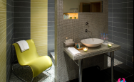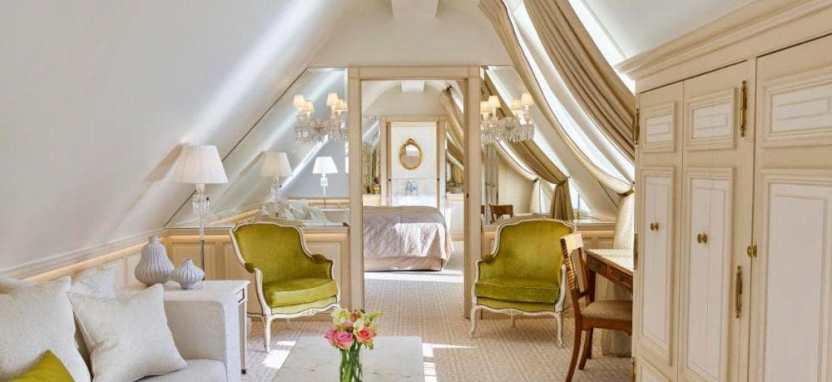 Parisienne Suite (63 кв. м) - номер в светлых кремовых тонах со скошенной крышей и видом на внутренний дворик. Спальня, просторная гостиная, ванная комната. Верхний этаж отеля.