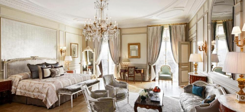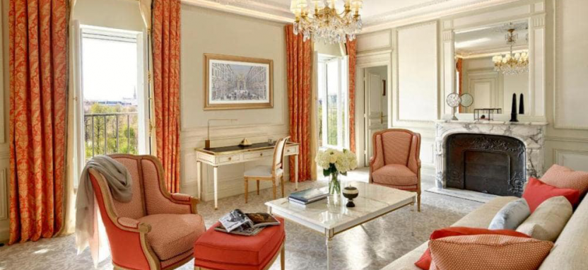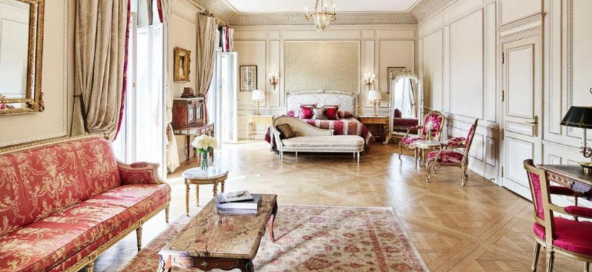 Versailles Suite Park View (85 кв. м) - номер на нижнем этаже здания отеля, с богато оформленной обстановкой, созданной под вдохновением от созерцания Версальского дворца. Спальня, гостиная, ванная комната. Вид на сады Тюильри.