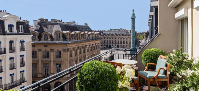 Vendome Suite (220 кв. м) - просторная терраса (60 кв. м), гостиная, мини-кухня, кабинет, две спальни, ванная комната с гидромассажной ванной и душем с функцией парной. Вид на Rue de la Paix и Вандомскую колонну.