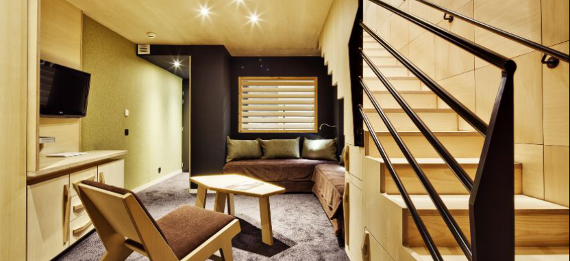 Duplex Family (50 кв. м) – двухуровневый люкс в современном шикарном стиле. На первом этаже — просторная гостиная (может использоваться как 2 спальни), отдельная комната для 2 детей (с кроватями 80×180 см) и ванная комната с душем. На втором — мезонин с наклонной спальней, открытой ванной комнатой с ванной и отдельным туалетом. Возможна установка детской кроватки. Максимальное размещение — 2 взрослых + 4 детей.