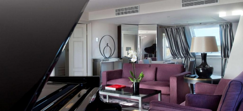 King Terrasse Castle View Suite (110 кв. м) – двухуровневый люкс на последнем 6-м этаже с видом на парк, спальня с кроватью king-size, гостиная зона с диваном, письменный стол, ванная комната с двойной раковиной, ванной и душем, туалетная комната, собственная терраса, отдельный вход на лифте. Размещение – 3 человека.