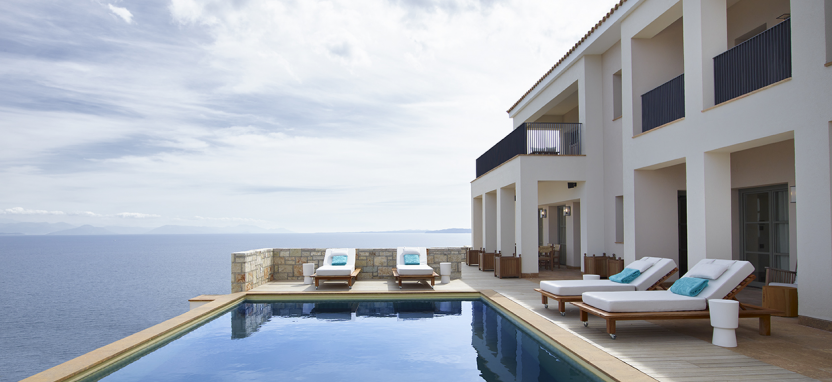 Ionian Seaview Pool Suite 3 pax (87 кв. м) - в номере спальня с большой кроватью, отдельная гостиная, мини-кухня, ванная комната с душем и ванной, частный бассейн, терраса в саду, вид на море.