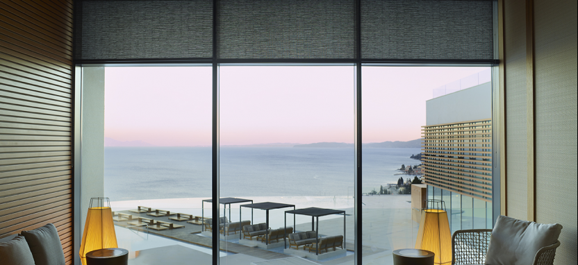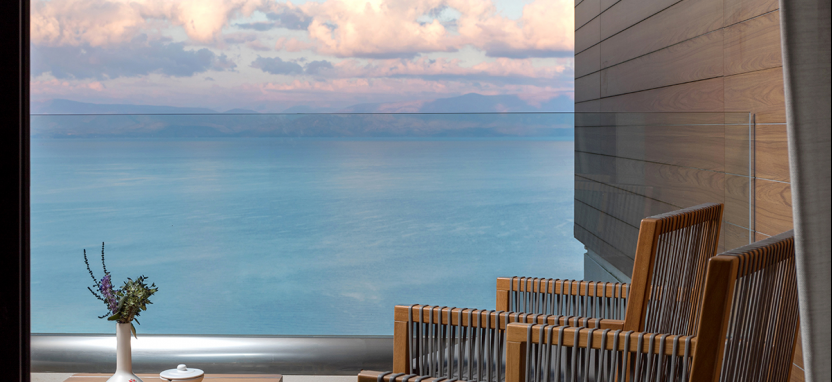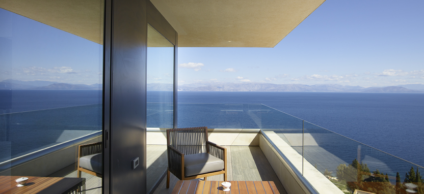 Ionian Seaview Corner Suite 3 pax (80 кв. м) - в номере спальня с большой кроватью, отдельная гостиная, панорамный (180 градусов) вид на море, ванная комната с душем и ванной, меблированная веранда с видом на море.