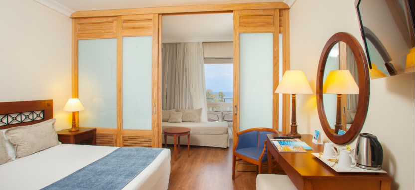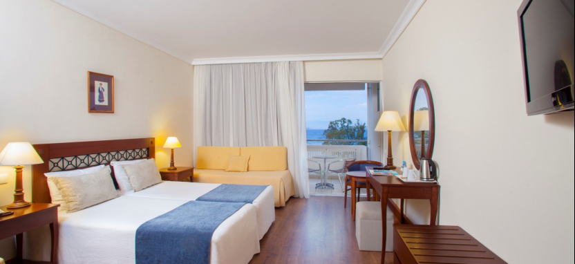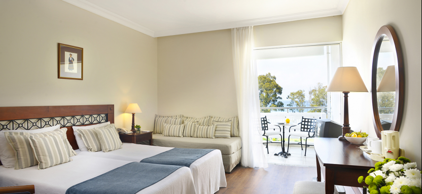 Family Room Inland View or Sea View (29 кв. м) - просторные семейные номера с современным дизайном, вид на территорию отеля или Ионическое море, гостиная зона, спальня, ванная комната, балкон. Максимальное размещение - 4 человека.