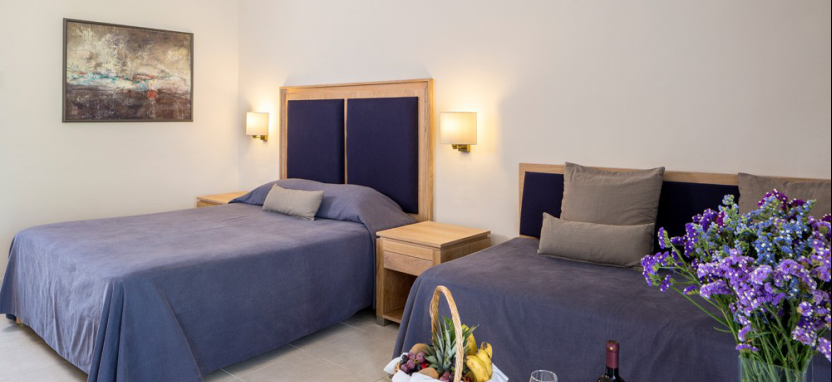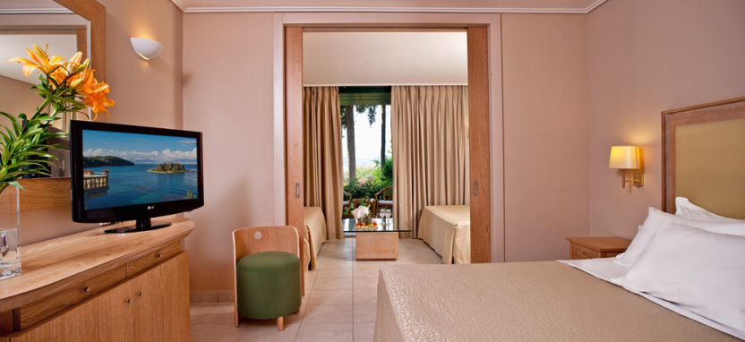 Family Room Garden View - Main Building (28 кв. м) - просторные семейные номера в главном корпусе, очаровательный вид на пышные сады и вечнозеленые холмы Корфу, 2 этаж. Прихожая, гостиная и спальня, разделенные раздвижной дверью, ванная комната с современной душевой кабиной, собственный балкон с летней мебелью. Максимальное размещение - 2 взрослых и 2 ребенка.