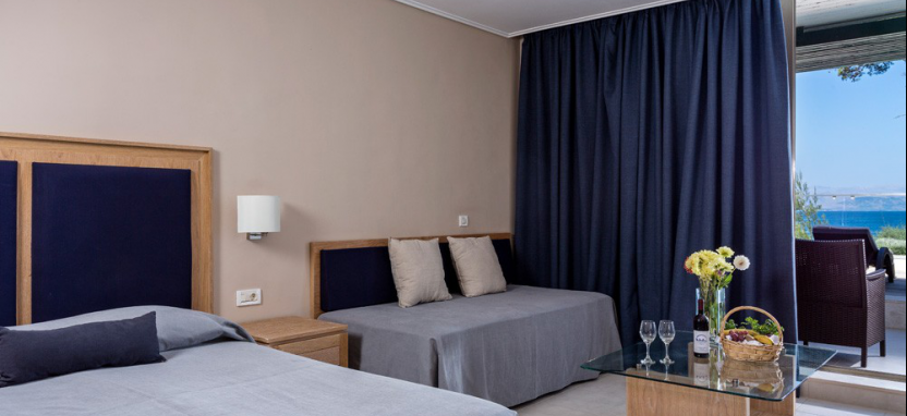 Family Room Sea View - Bungalow (36 кв. м) - просторные семейные номера в бунгало, оформленные в современном стиле, прекрасный вид на Ионическое море, пляж и побережье далекого материка, 1 этаж. Прихожая, гостиная и спальня, разделенные раздвижной дверью, ванная комната с современной душевой кабиной, отдельный туалет, собственная терраса. Максимальное размещение - 2 взрослых и 2 ребенка.