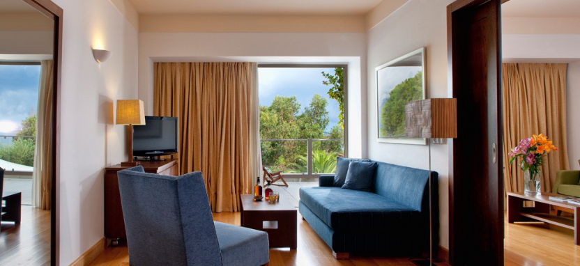 Executive Suite Two Bedroom - Sea View (Main Building)(107 кв. м) - роскошные представительские сьюты в главном корпусе, с элегантным дизайном в натуральных тонах в сочетании с умеренной роскошью и современными удобствами, прекрасный вид на Ионическое море и побережье материка, 5 этаж. Прихожая, отдельная просторная гостиная, 2 спальни с гостиными зонами, 2 современные ванные комнаты, собственная просторная терраса. Максимальное размещение - 2 взрослых и 3 ребенка или 3 взрослых и 2 ребёнка.