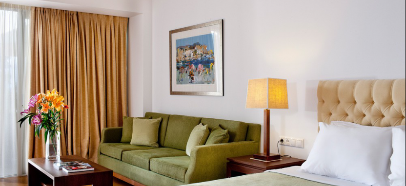 Family Room Bay View - Main Building (36 кв. м) - просторные семейные номера в главном корпусе, сочетающие превосходное эстетическое оформление и современный дизайн. Великолепный вид на залив Гувии и зеленые холмы Корфу, 5 этаж, прихожая, отдельная гостиная, спальня, ванная комната с ванной или душевой кабиной, собственный балкон с летней мебелью. Максимальное размещение - 2 взрослых и 2 ребенка.