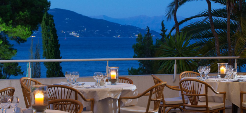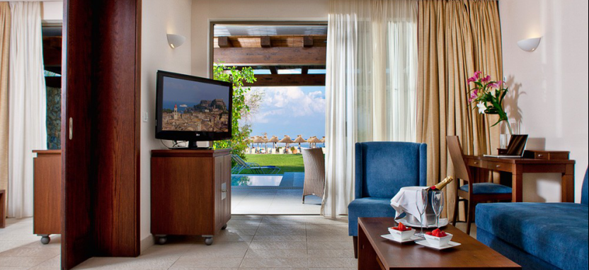 Presidential Suite - Top Floor (Main Building)(97 кв. м) - роскошный президентский сьют на верхнем этаже главного корпуса, сочетающий в себе сдержанную роскошь, непревзойденный комфорт и исключительный стиль, панорамный вид на Ионическое море, побережье острова, крепость и залив Гувии. Гостиная, 2 спальни, 2 ванные комнаты, spa-зона - квадратная ванна с джакузи, хамам, небольшой тренажерный зал, огромная деревянная терраса, частный подогреваемый бассейн с 2 джакузи. Максимальное размещение - 2 взрослых и 2 ребенка.