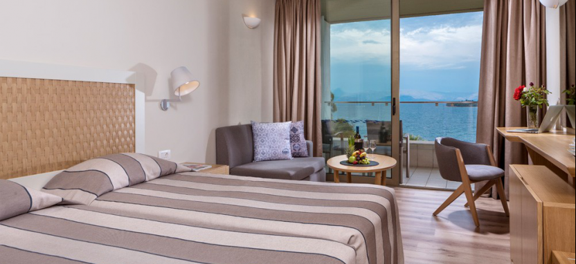 Sea Front - Main Building (23 кв. м) - просторные номера в главном корпусе, сочетающие современность и элегантность. Открытый вид на пляж, лазурные воды Ионического моря и далекий материк, 2 этаж на уровне ресепции, прихожая, спальня, ванная комната с ванной или душевой кабиной, балкон. Максимальное размещение - 2 взрослых и 1 ребенок.