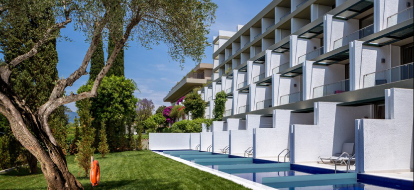 Garden View + Pool - Main Building (23 кв. м) - просторные номера в главном корпусе, сочетающие современную эстетику, удобную мебель и обилие солнечного света. Вид на великолепные вечнозеленые сады и величественные холмы Корфу, 1 этаж, прихожая, спальня, ванная комната с ванной или душевой кабиной, терраса, частный бассейн. Максимальное размещение - 2 взрослых и 1 ребенок.
