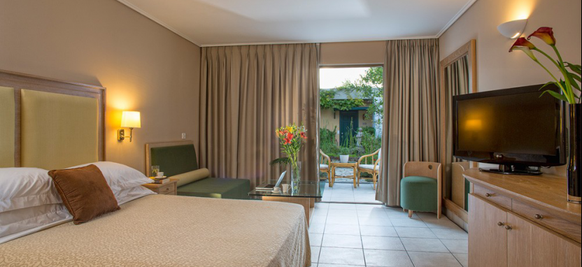 Garden View - Bungalow + Pool (26 кв. м) - просторные номера в бунгало, расположенные среди пышных садов и величественных холмов Корфу, вид на сад, 1 этаж. Прихожая, гостиная зона, спальня, ванная комната с ванной, терраса с садовой мебелью, большой бассейн с ограниченным доступом. Максимальное размещение - 2 взрослых и 2 ребенка.