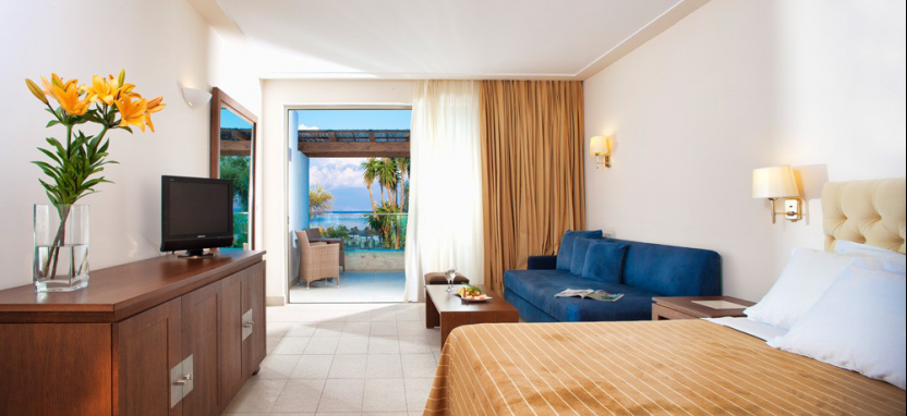 Deluxe Suite One Bedroom - Sea View (Main Building)(73 кв. м) - роскошные сьюты в главном корпусе, с уникальным эстетическим оформлением, прекрасный вид на Ионическое море, пляж и побережье материка, 5 этаж. Прихожая, гардеробная, отдельная гостиная, спальня, ванная комната, собственная терраса с удобной мебелью. Максимальное размещение - 2 взрослых и 1 ребенок.