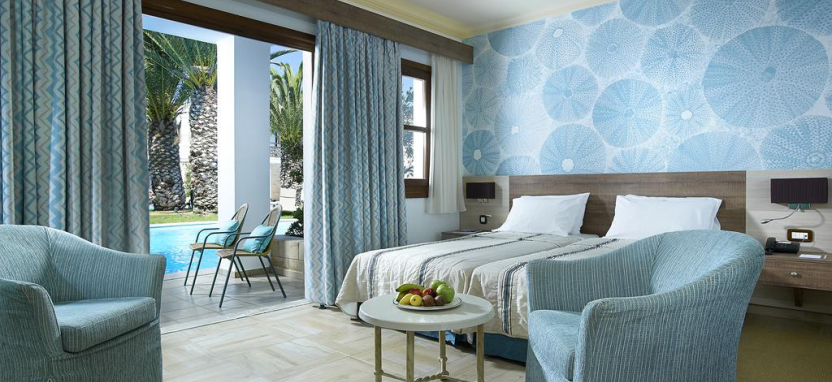 Junior Suite with Private Pool (49 кв. м) - вид на сад, гостиная зона, спальня, ванная комната с джакузи, терраса, приватный бассейн.