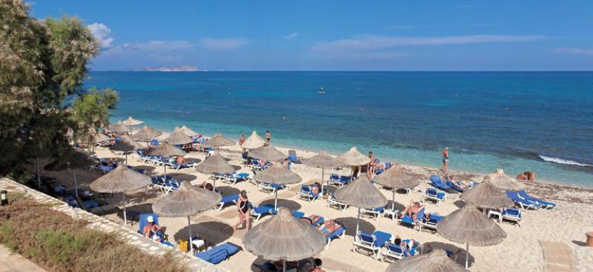 Собственный пляж с крупнозернистым песком, оборудованный душевыми, кабинками для переодевания, шезлонгами и зонтиками.