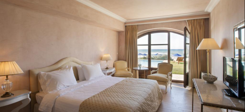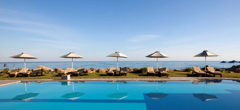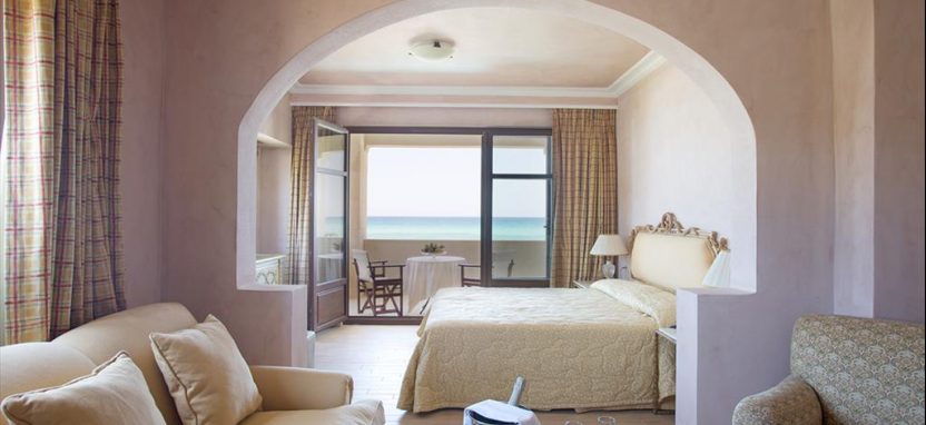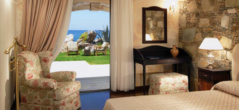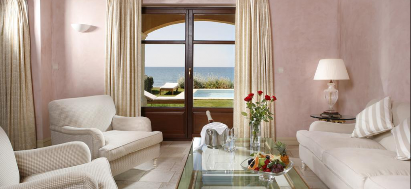 Mythica Club Deluxe Junior Villa Sea View with Private Pool 2 pax (125 кв. м) - виллы в традиционном критском стиле, в саду, на берегу моря, уютная гостиная, столовая зона, спальня, ванная комната, терраса, частный бассейн. Вид на море.