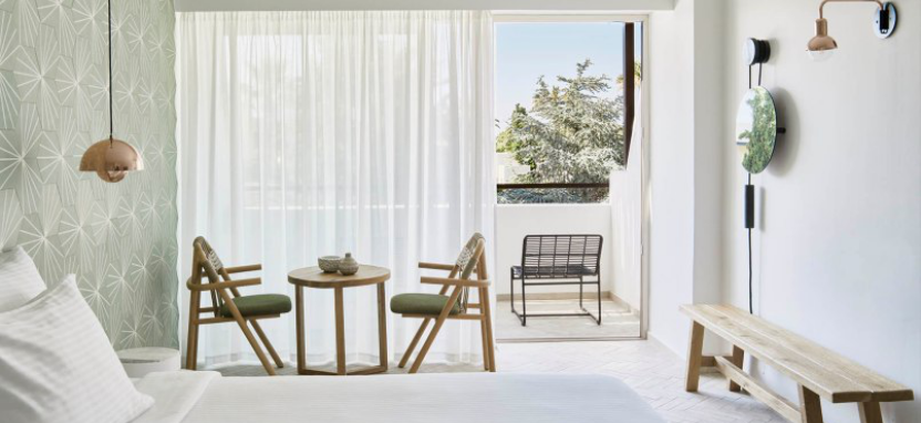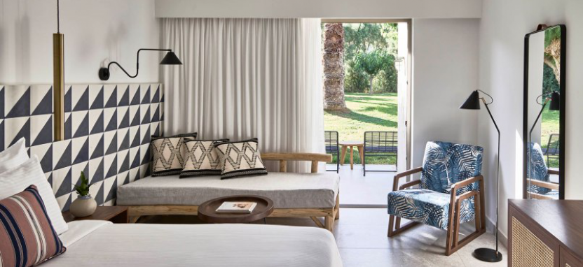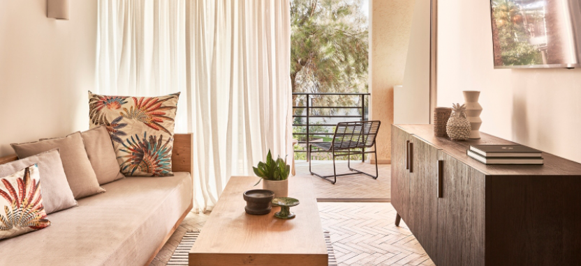 Junior Suite 4 pax (34 кв. м) - гостиная и спальня открытого плана, ванная комната, балкон или терраса. Вид на сад.