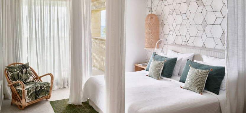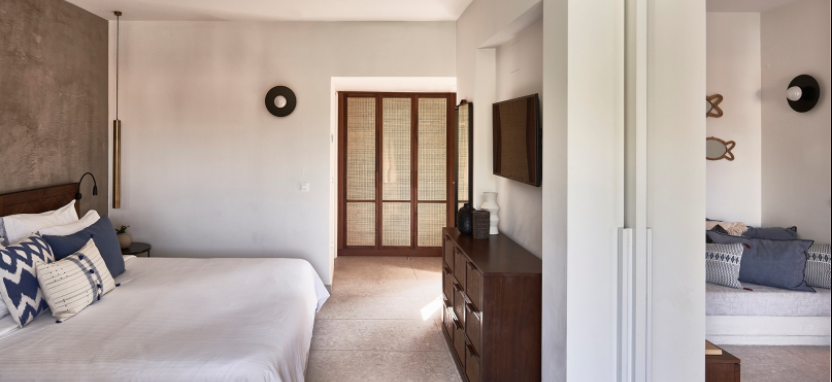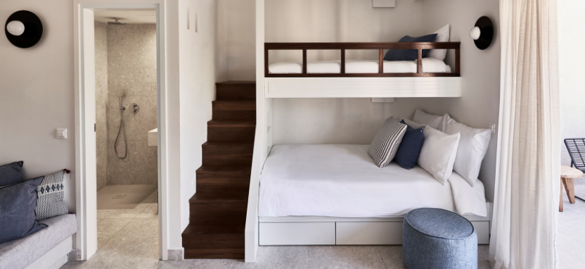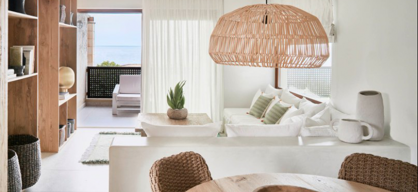 Junior Suite Sea Front 4 pax (34 кв. м) - расположены на берегу. Гостиная и спальня открытого плана, ванная комната, балкон или терраса. Фронтальный вид на море.