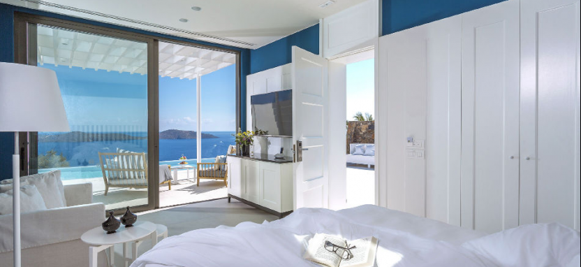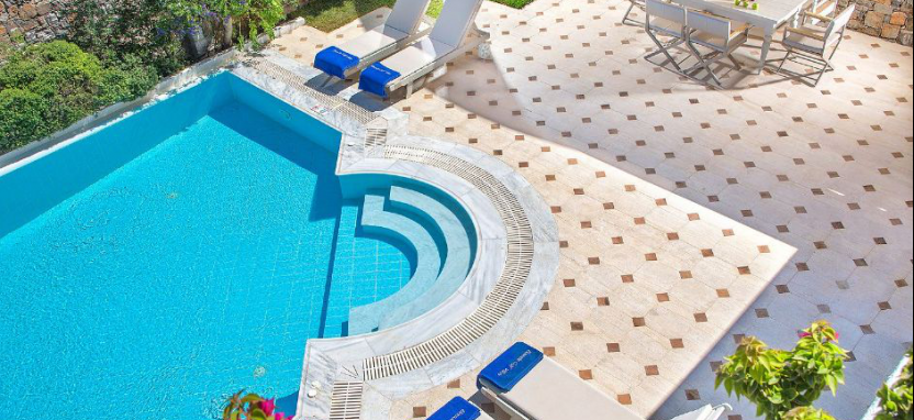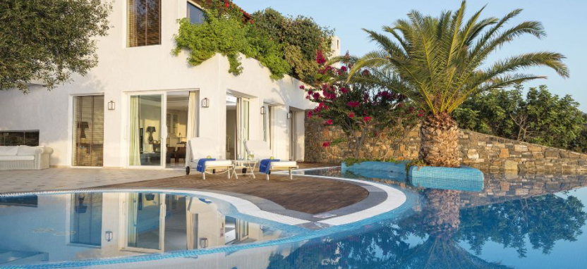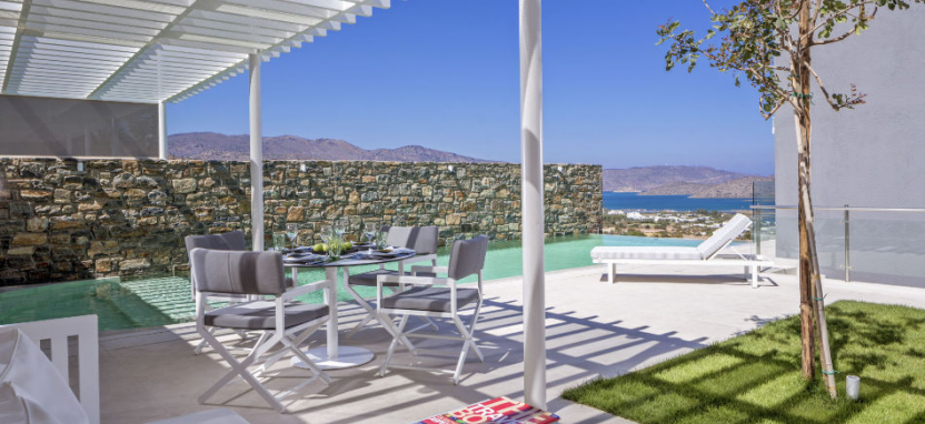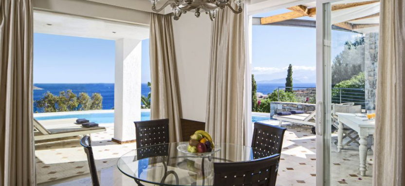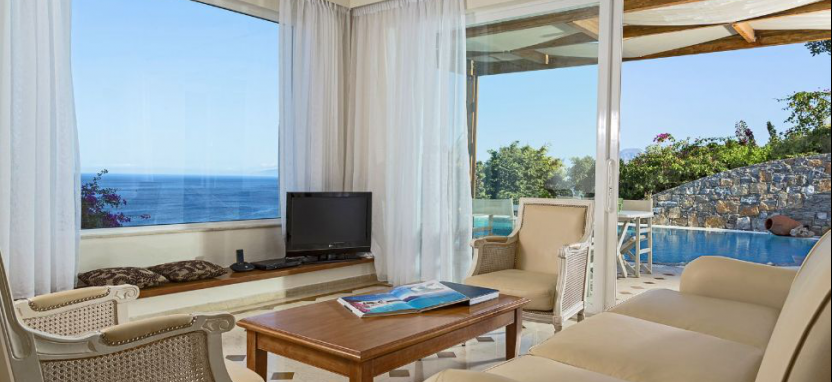 Elounda Pool Villas 4 pax (120-150 кв. м) - гостиная, кухня оборудованная всем необходимым, 2 спальни, 2 ванные комнаты, частный бассейн, джакузи. Вид на море.