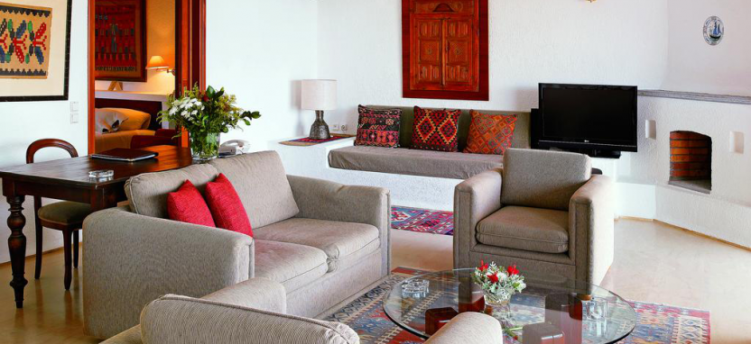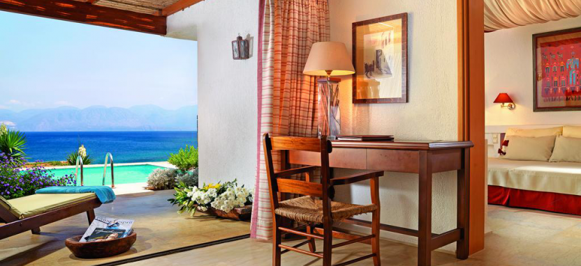 King Minos Royalty Suite with Private Pool (150 кв. м) - великолепный вид на море, отдельная просторная гостиная, гардеробная, 2 спальни, 2 ванные комнаты, душевая кабина, в одной из них джакузи, собственный тренажерный зал с сауной и хамам, просторная терраса, небольшой личный сад, большой индивидуальный бассейн.