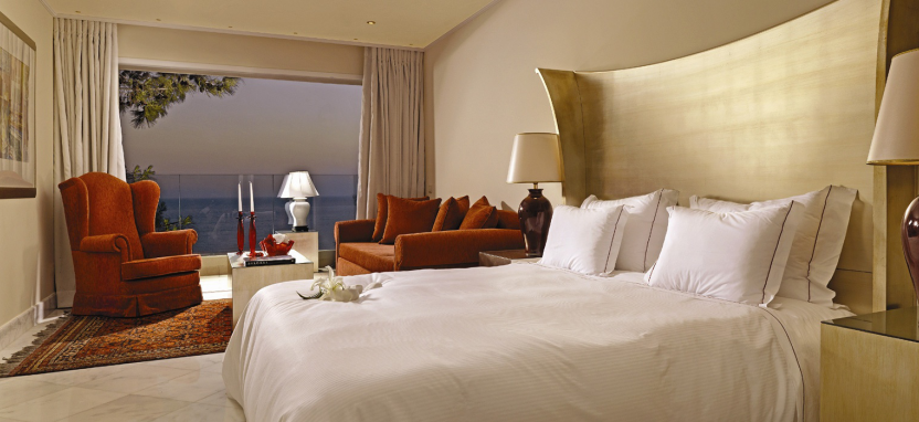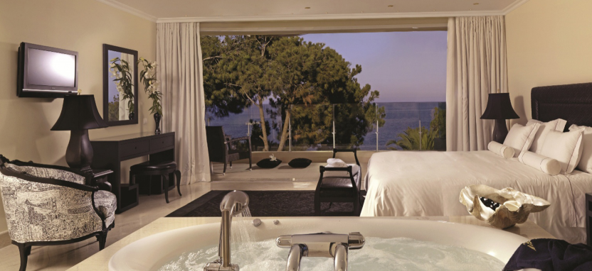 Seafront 1-Bedroom Suite 2/3 pax (60 кв. м) - элегантные сюиты, фронтальный вид на Эгейское море, отдельная просторная гостиная, спальня, просторная ванная комната с джакузи и душевой кабиной, гостевой туалет в некоторых сюитах, балкон.