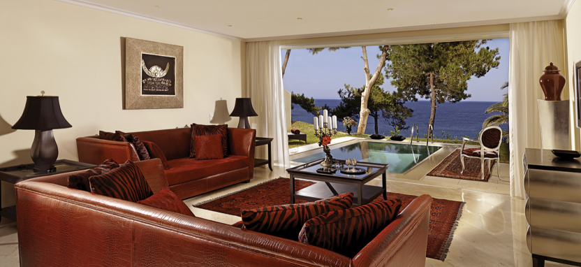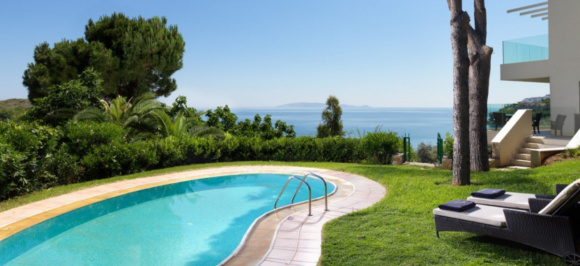 Seafront 1-Bedroom Love Story Maisonette Villa 2/3 pax (100 кв. м) - эксклюзивные двухуровневые номера мезонеты с максимальным комфортом и непревзойденной роскошью, восхитительный вид на Эгейское море, просторная гостиная, обеденная зона, спальня с зоной для отдыха, ванная комната с джакузи и душевой кабиной, балкон, элегантная терраса, частный сад, частный бассейн (16 кв. м).