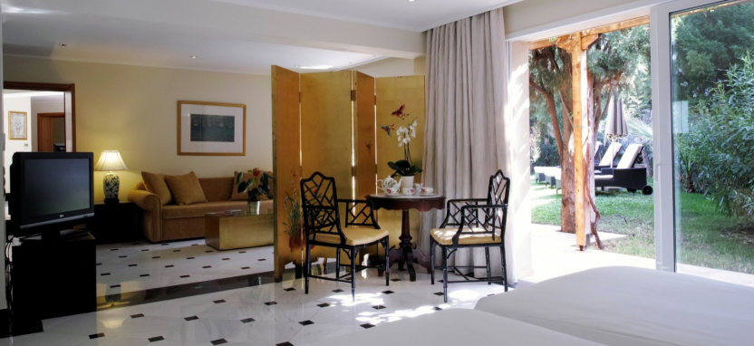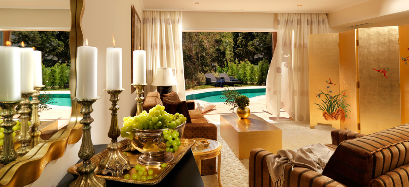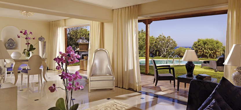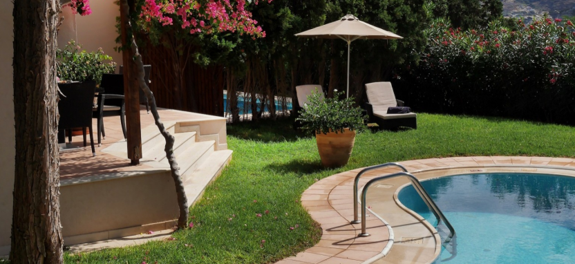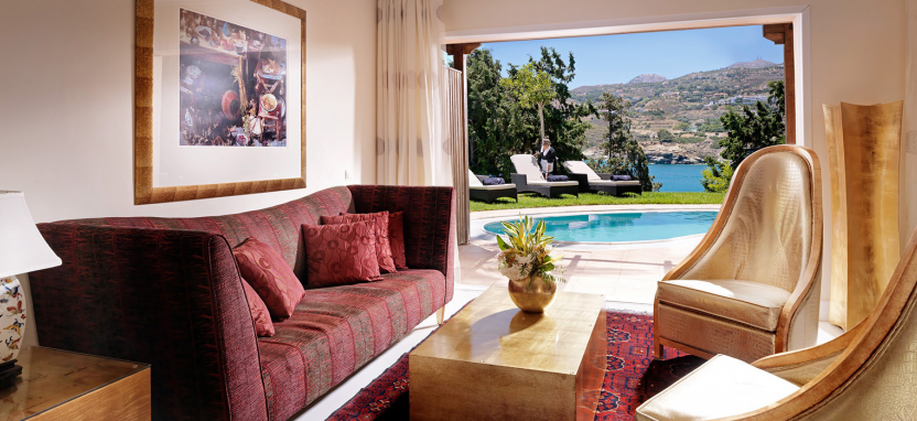 Luxury 1-Bedroom Suite with Sharing Pool 2/3 pax (45-60 кв. м) - роскошные сюиты, вид на Эгейское море и живописный сад, 1 этаж, отдельная гостиная, спальня, ванная комната с ванной-джакузи и душевой кабиной, общий для нескольких номеров сад и бассейн (17 кв. м).