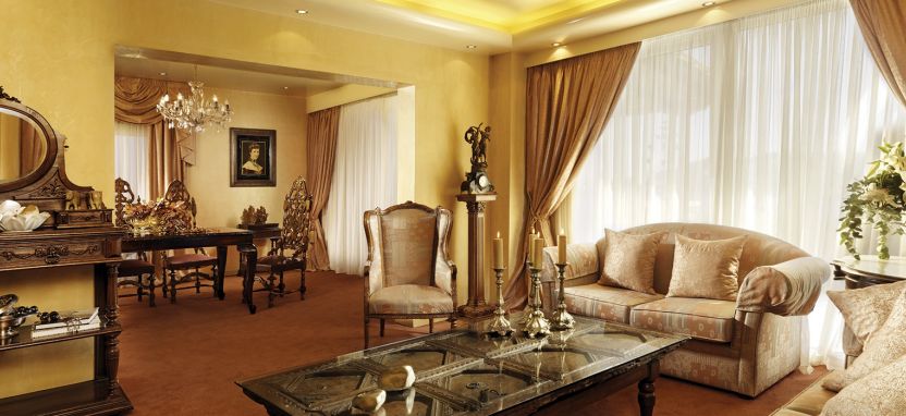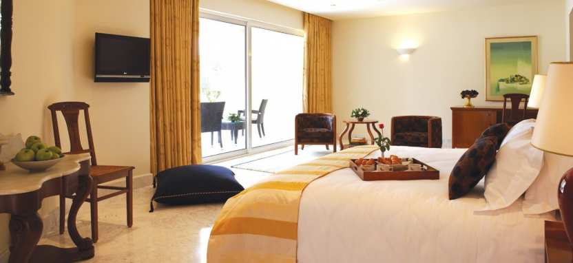 Classic 2 Bedroom Suite 4/5 pax (70 кв. м) - просторные сюиты в главном здании, декор которых совмещает в себе элегантный европейский и традиционный греческий стиль, вид на главный бассейн, 1 этаж, отдельная просторная гостиная, 2 спальни, 2 ванные комнаты, отделанные мрамором, одна с джакузи, другая с отдельной душевой кабиной, терраса.