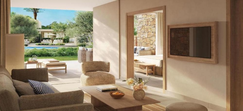 Deluxe One-Bedroom Bungalow Suite (71 кв. м) – вид на бассейн, спальня с кроватью king-size, отдельная гостиная, ванная комната с ванной и душевой кабиной, приватный сад.