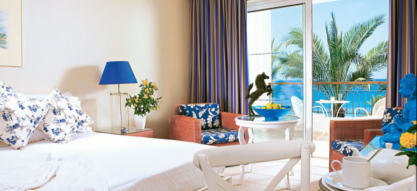Superior Bungalow Sea View 2/3 pax (30 кв. м) - улучшенные просторные номера в бунгало в саду среди экзотических пальм. Великолепный вид на Ионическое море. 1 или 2 этаж, прихожая, гостиная зона, спальня, ванная комната с ванной, терраса или балкон.