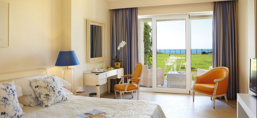 Luxury Guestroom Direct Sea View 2/3 pax (30 кв. м) - новые роскошные номера, идеальные для размещение для пар, на верхнем этаже основного здания. Панорамный вид на Ионическое море. Прихожая, гостиная зона, спальня, ванная комната с ванной, просторная веранда под навесом с летней мебелью.