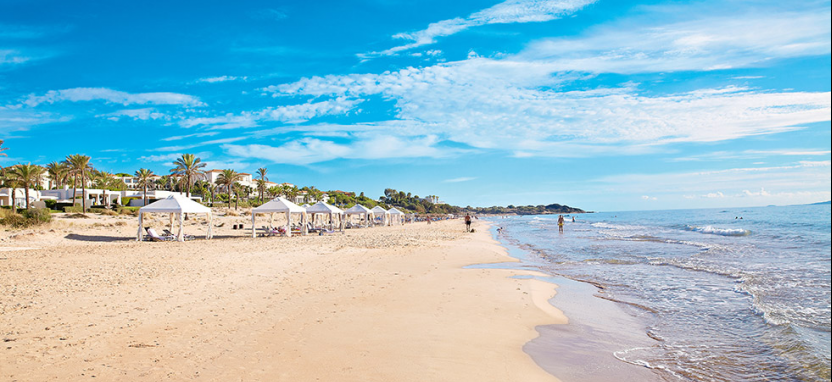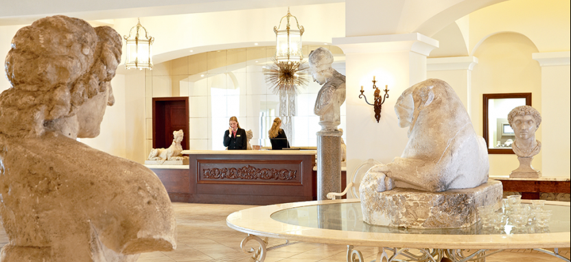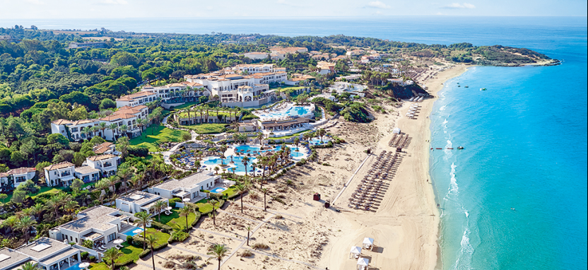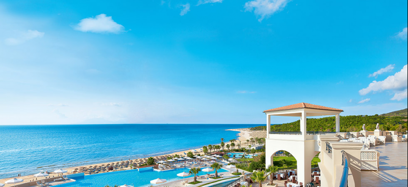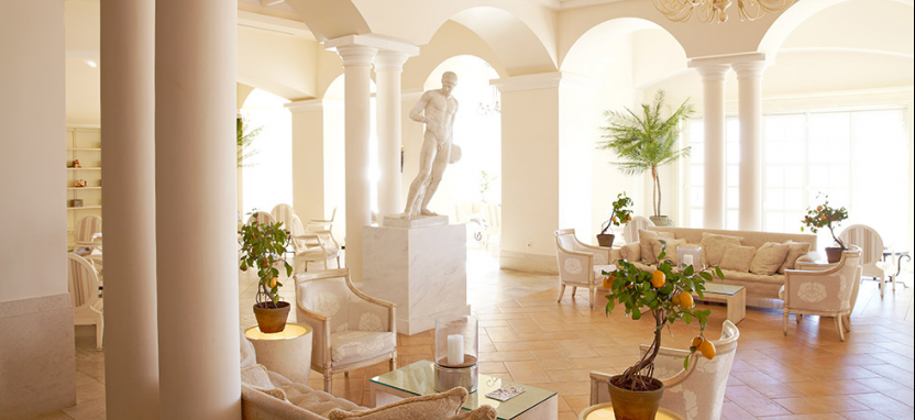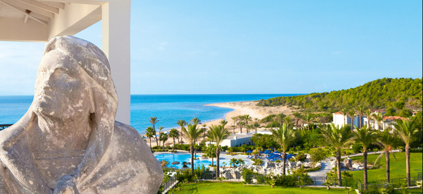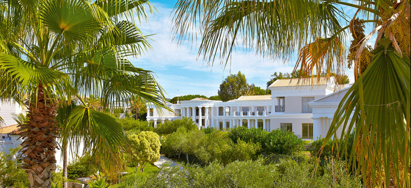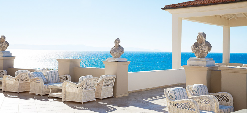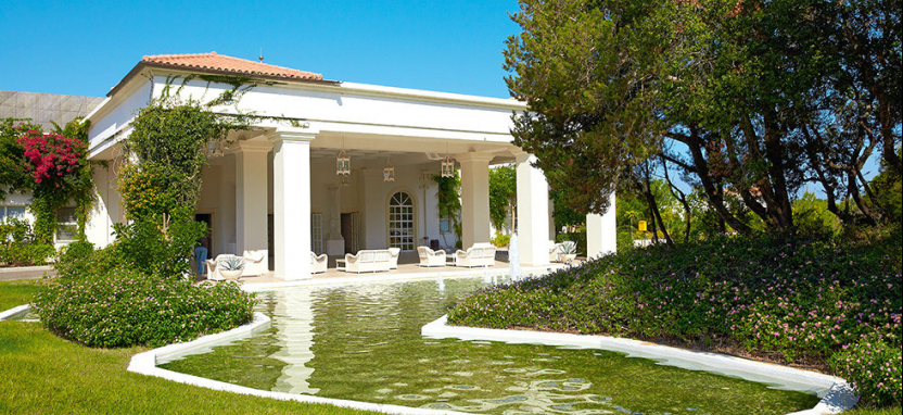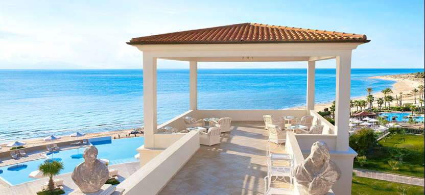 Белоснежные элегантные здания отеля, выполненные в стиле классической греческой архитектуры, располагаются среди живописного сада и раскидистых пальм, на берегу лазурного Ионического моря.