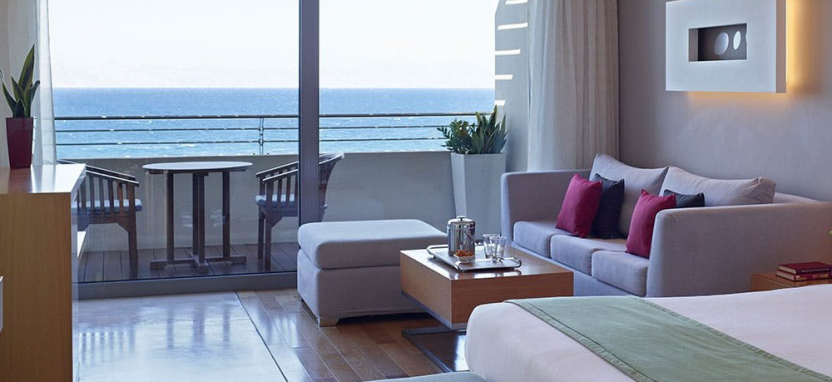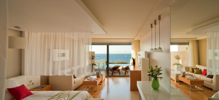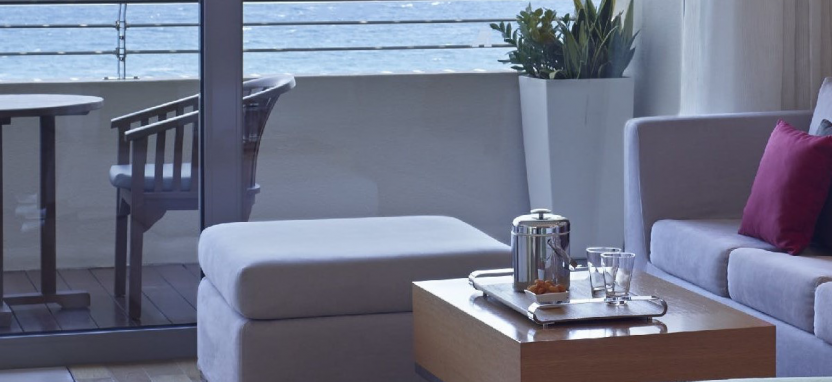 Elite Suites (44 кв. м) - в номере спальня с большой кроватью, панорамный вид на море, деревянные полы, ванная комната, балкон или терраса.