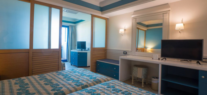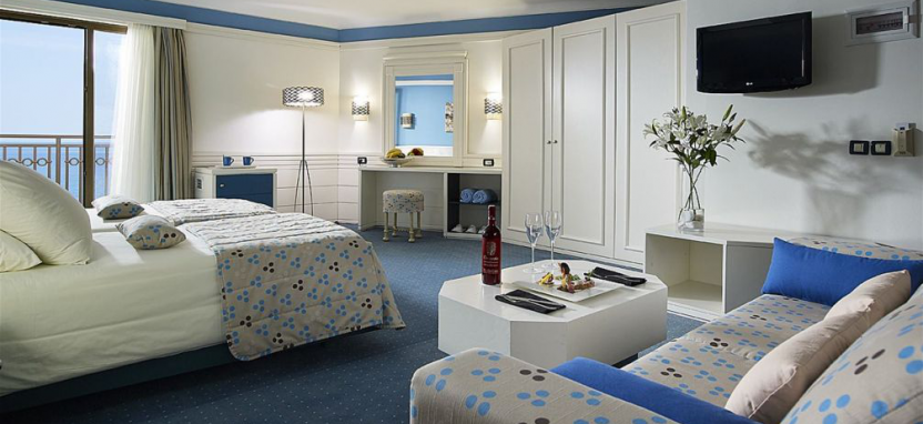 Suite Sea View 4 pax (48 кв. м) - гостиная, спальня ванная комната, балкон или терраса. Вид на море. Дополнительно: халат, тапочки, VIP завтрак, бесплатный приветственный пакет (вино, минеральная вода, тарелка фруктов, сладости), набор для приготовления чая/кофе, VIP банные принадлежности, пляжные полотенца, ежедневно: минеральная вода, пополнение набора для приготовления чая/кофе.